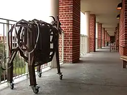 Wiess Hall was completed in 1949, but carried the name "North Hall" until its dedication in March 1950.[50] It was laid out as a W-shaped building, with three north–south wings, joined on the north ends by a long east–west spine, forming two open quadrangles.[51] The building was two stories high except for the three-story center wing. The hall was designed to house about 200 students in 20 single and 90 double rooms. Each room at Wiess opened directly to an exterior walkway that wrapped around the entire building. This design incorporated two features that were innovative at the time: every room had a semi-private bathroom and every room (except room 228, which was reserved for freshmen) had windows on at least two sides—an important adaptation in the years before air conditioning.[52]