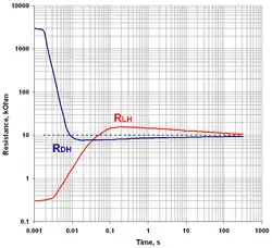 Cadmium-based photoresistors exhibit a pronounced memory effect, that is, their resistance depends on the history of illumination.[55] It also shows characteristic overshoots, with the values reaching a temporary minimum or maximum after application of light. These resistivity changes affect the RO temperature, bringing additional instabilities. The stabilization time nonlinearly increases with the light intensity and can vary between hours and days;[7] by convention, it is assumed that the output of an illuminated RO reaches equilibrium within 24 hours.[6]