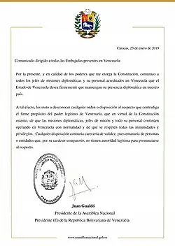 - ^ "Declaration by the High Representative on behalf of the European Union on latest developments in Venezuela". Council of the European Union. 23 January 2019. Retrieved 23 January 2019.