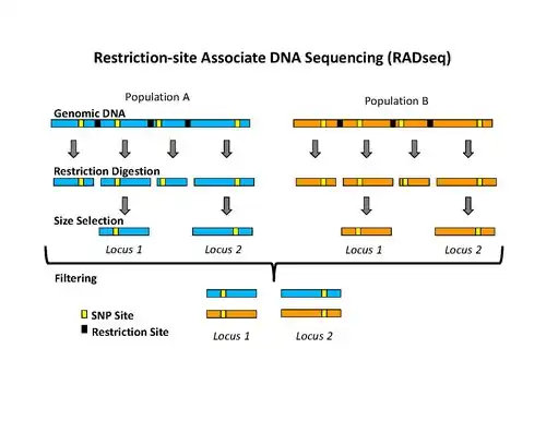 - ^ a b Peterson BK, Weber JN, Kay EH, Fisher HS, Hoekstra HE (2012). "Double digest RADseq: an inexpensive method for de novo SNP discovery and genotyping in model and non-model species". PLOS ONE. 7 (5): e37135. Bibcode:2012PLoSO...737135P. doi:10.1371/journal.pone.0037135. PMC 3365034. PMID 22675423.