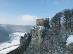 Reussenstein Castle (Ruine Reußenstein: the Reussenstein Ruin) is ruins of a medieval fortress in Germany. It is situated 760 metres (2,490 ft) above sea level overlooking Neidlingen in Baden-Württemberg, Germany.