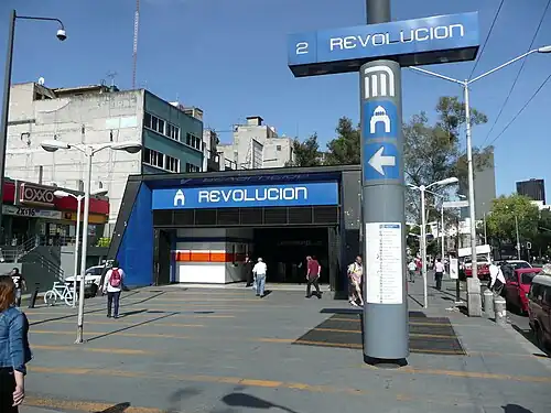 Revolución is a station on Line 2 of the Mexico City Metro system.[2][3] It is located in the Colonia Tabacalera and Colonia Buenavista districts in the Cuauhtémoc borough of Mexico City, northwest of the city centre, on Avenida México - Tenochtitlan.[2] It was first opened to the public on 14 September 1970.[4]