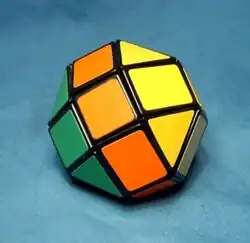 The rhombicuboctahedron may also be found in toys. For example, if the lines along which a Rubik's Cube can be turned are projected onto a sphere, they are topologically identical to a rhombicuboctahedron's edges. Variants using the Rubik's Cube mechanism have been produced, which closely resemble the rhombicuboctahedron. During the Rubik's Cube craze of the 1980s, at least two twisty puzzles sold had the form of a rhombicuboctahedron (the mechanism was similar to that of a Rubik's Cube)[20][21] Another example may be found in dice from Corfe Castle, each of whose square faces have marks of pairs of letters and pips.[22]