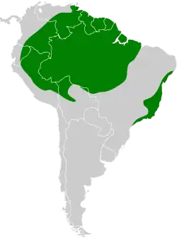 The greyish mourner has a disjunct distribution. The nominate subspecies is found in eastern Brazil from Alagoas south to eastern Minas Gerais and southwestern São Paulo. Subspecies R. s. frederici is found much more widely, from southeastern Colombia south through eastern Ecuador and eastern Peru into northwestern Bolivia and east through southern and eastern Venezuela, the Guianas, and Amazonian Brazil with the eastern edge roughly bounded by Mato Grosso, northern Goiás, and northern Maranhão. The species primarily inhabits the mid-story to upper story of humid terra firme forest and occasionally the transition zone between it and other forest types.[6] In Brazil it is mostly found from sea level to 800 m (2,600 ft) and sometimes higher.[7] It Colombia and Ecuador it reaches 700 m (2,300 ft), in Peru 1,400 m (4,600 ft), and in Venezuela 1,300 m (4,300 ft).[8][9][10][11]