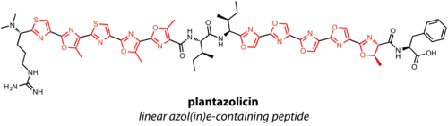 - ^ Molohon KJ, Melby JO, Lee J, Evans BS, Dunbar KL, Bumpus SB, Kelleher NL, Mitchell DA (2011). "Structure determination and interception of biosynthetic intermediates for the plantazolicin class of highly discriminating antibiotics". ACS Chemical Biology. 6 (12): 1307–13. doi:10.1021/cb200339d. PMC 3241860. PMID 21950656.