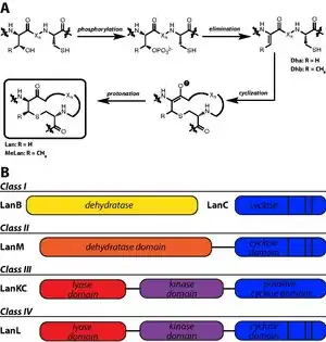 Four classes of lanthipeptide biosynthetic enzymes have been designated.[41] Class I lanthipeptides have dedicated lanthipeptide dehydratases, called LanB enzymes, though more specific designations are used for particular lanthipeptides (e.g. NisB is the nisin dehydratase). A separate cyclase, LanC, is responsible for the second step in Lan and MeLan biosynthesis. However, class II, III, and IV lanthipeptides have bifunctional lanthionine synthetases in their gene clusters, meaning a single enzyme carries out both dehydration and cyclization steps. Class II synthetases, designated LanM synthetases, have N-terminal dehydration domains with no sequence homology to other lanthipeptide biosynthetic enzymes; the cyclase domain has homology to LanC. Class III (LanKC) and IV (LanL) enzymes have similar N-terminal lyase and central kinase domains, but diverge in C-terminal cyclization domains: the LanL cyclase domain is homologous to LanC, but the class III enzymes lack Zn-ligand binding domains.[42]
