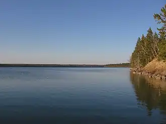 During the last ice age most of the vegetation in the Riding Mountain region was eliminated, and it remained this way after the retreat of the glaciers 12,500 years ago.[31] The Riding Mountain upland and surrounding plains and Manitoba Escarpment were mostly carved in the Tertiary era, but the ice sheets of the Pleistocene period modified the drainage and appearance of the land.[29] Only the movement of the last ice sheet in this period left a visible effect on the features of the region.[29] About 11,500 years ago a spruce dominated forest began to emerge in its place, with some of the vegetation being ash, juniper, sedges, buffaloberry, and trembling aspen.[31] After this time the climate was dry, and the percentage of spruce decreased.[31] During the Holocene climatic optimum up until 6500 years ago the amount of herbs, shrubs and grasses in the park increased. At the end of this time beaked hazelnut appeared and the amount of bur oak increased, with the climate becoming cooler and moister.[31] Up to 2,500 years ago the amount of grassland species in general decreased and boreal forests migrated into the Riding Mountain region. It was at this moment that ecosystems began to resemble those of today, with species such as tamarack, fir, alder, pine and spruce becoming more common.[31] Several streams that run through the park have headwaters in Riding Mountain's lakes.[29] Clear Lake's water comes from underground springs rather than from streams.[29]