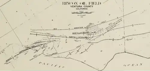 The Rincon field is at the western end of the Ventura Anticline, a long narrow structure rather like the gabled roof on a long house, beneath which petroleum has collected in abundance. Two other similar onshore fields follow the anticline: the San Miguelito field to the southeast and the huge Ventura Oil Field beyond the San Miguelito, directly north of the city of Ventura. West of the Rincon field the anticline continues offshore, containing in the Carpinteria offshore field and the Dos Cuadras field, the source of the notorious 1969 oil spill. The surface geology of the Rincon field is distinctive, including some of the most landslide-prone terrain in California; much of the surface consists of Holocene sedimentary landslide deposits, greatly prone to renewed landslides.[3]