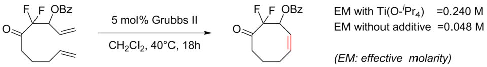 Additives are also used to overturn conformational preferences, increase reaction concentration, and chelate highly polar groups, such as esters or amides, which can bind to the catalyst.[2] Titanium isopropoxide (Ti(OiPr)4) is commonly used to chelate polar groups to prevent catalyst poisoning and in the case of an ester, the titanium Lewis acid binds the carbonyl oxygen. Once the oxygen is chelated with the titanium it can no longer bind to the ruthenium metal of the catalyst, which would result in catalyst deactivation. This also allows the reaction to be run at a higher effective concentration without dimerization of starting material.[48]