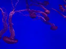 - The Planet Jellies exhibit has colour changing displays with five species of jellyfish. These include: Pacific sea nettle, moon jelly, spotted jelly, and upside-down jelly.[1]