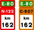 According to the standard, only the official names of towns and communities may appear on signs.[1]: 21 In the event that there is no official place name, the place name is first written in the regional language followed by a slash and the place name in Spanish. Where there is a lack of space, the place names are placed on two lines, with the name in the local language shown first followed by that in Spanish, with a horizontal line between them. No distinction is made in typography between both languages.