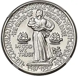The Roanoke Island, North Carolina, half dollar (also Roanoke Island half dollar) is a commemorative coin issued by the United States Bureau of the Mint in 1937. The coin commemorated the 350th anniversary of the Roanoke Colony, depicting Sir Walter Raleigh on one side, and on the other Eleanor Dare, holding her child, Virginia Dare, the first child of English descent born in an English colony in the Americas.