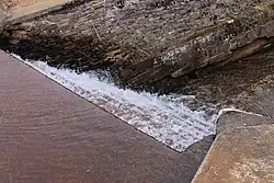 The headwaters of Roaring Brook are in a 30-acre lake known as Harris Pond.[2][9] It is dammed by the Harris Pond Dam, which is made from earth, concrete, and masonry. It is approximately 10 feet (3.0 m) high and 135 feet (41 m) long (including the spillway). As of 1981, the dam is in relatively good condition.[1]