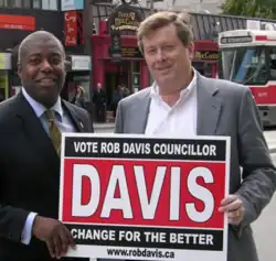 Rob Davis (born 1964) is a Canadian politician. He served on the City of York council from 1991 to 1997. He was the first Black city councillor in the 200-year history of the City of York. He was elected as a member of the amalgamated Toronto City Council from 1997 to 2000. He was also the first Black city councillor of the amalgamated Toronto City Council. In 2023, Davis unsuccessfully ran for mayor of Toronto in a by-election called as a result of the resignation of Mayor John Tory. Davis told the media that Torontonians no longer felt safe on the TTC, were struggling with the high cost of housing, and thought the council was wasting taxpayer's money on changing the name Dundas instead of helping the homeless and people who are less fortunate. Davis vowed to make Toronto safer, cleaner, and kinder.[1]