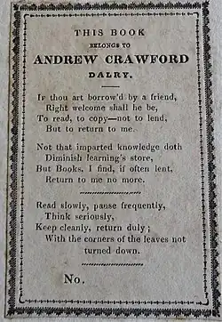 One copy bears the unusual bookplate of a fellow contemporary land surveyor, Andrew Crawford of Dalry, a gentleman of some standing, who was the chairman of Dalry Burns club from 1828 to 1843.[3] He is not listed amongst the subscribers.