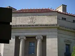 The design by Zantzinger, Borie, and Medary blends influences from neoclassical (Greek Revival) and Art Deco architectural styles.[3] The design is similar to other Federal Triangle buildings, with an Indiana limestone facade over a steel frame, red-tile hip roof, and colonnades, as well as interior courtyards to provide natural light and ventilation.[3] The inscription on one of the sides of the Robert F. Kennedy Department of Justice Building is, "Justice is founded in the rights bestowed by nature upon man. Liberty is maintained in security of justice."