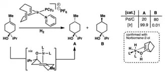 12. ^ Crabtree, Robert H.; Davis, Mark W. (May 1983). "Occurrence and origin of a pronounced directing effect of a hydroxyl group in hydrogenation with [Ir(cod)P(C6H11)3(py)]PF6". Organometallics. 2 (5): 681–682. doi:10.1021/om00077a019. ISSN 0276-7333.