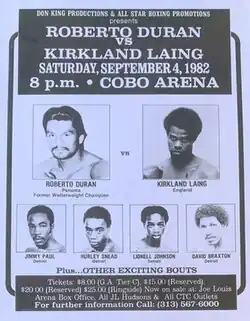 Roberto Durán vs. Kirkland Laing was a professional boxing match contested on September 4, 1982.[3] The virtually unknown Laing scored an upset win over Durán, a 2-division world champion who was considered one of boxing's top fighters.