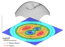 A three-dimensional representation of the Roche potential in a binary star with a mass ratio of 2, in the co-rotating frame. The droplet-shaped figures in the equipotential plot at the bottom of the figure define what are considered the Roche lobes of the stars. L1, L2 and L3 are the Lagrangian points where forces (considered in the rotating frame) cancel out. Mass can flow through the saddle point L1 from one star to its companion, if the star fills its Roche lobe.[1]