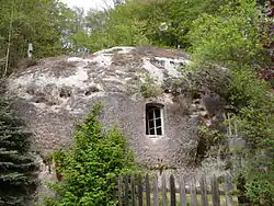 The unique chapel was hollowed entirely out of a free-standing block of sandstone that resembles a loaf of bread. From the outside only a small cross and the two windows are visible. Inside, only the moisture percolating through from above indicates that the chapel was hewn out of solid rock.