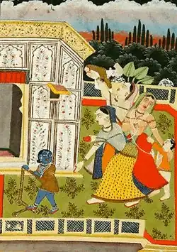 Krishna, the eighth child of Devaki, was exchanged with the daughter of Nanda and Yashoda in secrecy. Yashoda (foster-mother of Krishna) and Rohini play an important nurturing Krishna and Balarama in their childhood.[5]