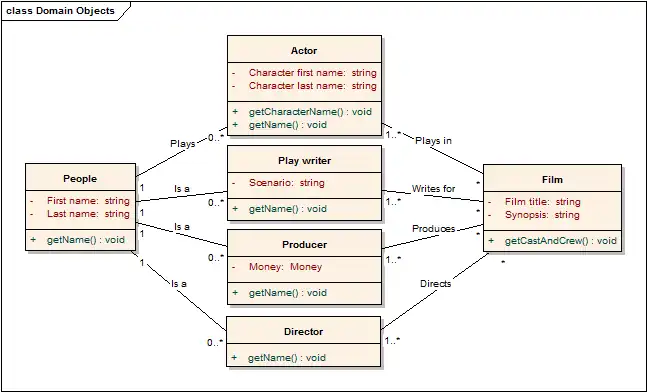 A solution to the previous problem could be to use the Association Role Model, which could create an association between a person and a film. However, specific information on each role could not be stored in such a case. The role class model provides the flexibility of the association with role-specific attributes and even class operations, if needed.