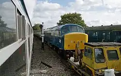 D7523 was built by British Railways at Derby in 1965 and started its career at Toton TMD before moving around various London Midland Region sheds such as Willesden, Longsight, and Crewe. It was renumbered 25173 in 1974.[12] It had been based at the Crewe Heritage Centre and on the West Somerset Railway.[13] It arrived at the railway on 7 September 2011 and will be used for engineering and ballast trains and for maintenance and testing of vacuum-braked coaches.[14] It is currently in BR Green, Undergoing heavy overhaul.[8]
