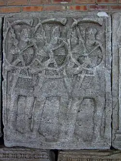 Legionary soldiers of the 1st and 2nd centuries used a variety of armour types. Some wore mail shirts, while others wore scale armour or lorica segmentata or laminated-strip cuirass. This last type was a complex piece of armour which in certain circumstances provided superior protection to the other types of Roman armour, mail armour (lorica hamata) and scale armour (lorica squamata). The testing of modern replicas has demonstrated that this kind of armour was impenetrable to most direct hits and missile strikes. It was, however, uncomfortable without padding: re-enactors have confirmed that wearing a padded undergarment known as a subarmalis relieves the wearer from bruising both from prolonged wear and from shock produced by weapon blows against the armour. It was also expensive to produce and difficult to maintain.[23] In the 3rd century, the segmentata appears to have been dropped and troops are depicted wearing mail armour (mainly) or scale, the standard armour of the 2nd-century auxilia. The artistic record shows that most late soldiers wore metal armour, despite Vegetius's statement to the contrary. For example, illustrations in the Notitia show that the army's fabricae (arms factories) were producing mail armour at the end of the 4th century.[24] Actual examples of both scale armour and quite large sections of mail have been recovered, at Trier and Weiler-La-Tour respectively, within 4th-century contexts.[25] Officers generally seem to have worn bronze or iron cuirasses, as in the days of the principate, together with traditional pteruges.[26]