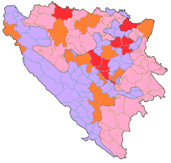Municipalities with the largest Roma communities in Bosnia and Herzegovina: in red above 1,000 persons reported, in orange below 1,000[7]