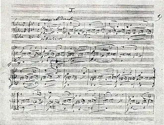 His mother-in-law hired out a room to a young chemistry student, Josef Kruis. Kruis was also an amateur violinist who studied the violin with Jan Pelikán, a member of the orchestra of the National Theatre in Prague.[3] They often played violin duets together. Dvořák, a viola player, heard them and got the idea to compose a new chamber work for two violins and viola in order to play with them.[3] The resulting composition was the Terzetto in C major, Op. 74, B. 148, composed from 7 to 14 January 1887. It was, however, too difficult for Kruis, and Dvořák therefore composed another trio, but considerably simpler.[3] The second trio, Miniatures, was written in four movements, which he titled: "Cavatina", "Capriccio", "Romance" and "Elegy" ("Ballad"). In the letter dated 18 January 1887 to his German publisher Simrock, Dvořák stated: "I am writing little miniatures – just imagine – for two violins and viola, and I enjoy the work as much as if I were writing a large symphony – what do you say to that? Of course, they are meant rather for amateurs, but didn't Beethoven and Schumann also express themselves sometimes with quite simple means – and how?..."[3] Though he was apparently satisfied with this version of the trio, he nevertheless immediately began to rearrange it for violin and piano. He called the new version Romantic Pieces, Op. 75. The only date appears at the end of the manuscript – 25 January 1887. Dvořák later completely forgot about the existence of the trio, and years later in 1901 explained to Simrock that "...what is supposed to be a trio...cannot be the Romantic Pieces".[3] Dvořák's original manuscript of the trio version (and Kruis' copy of individual parts) was only rediscovered in 1938, and it was proven that he himself was mistaken.[3]