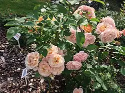 Double, flat or slightly cupped flowers with a strong, fruity fragrance, and an average diameter of 10 cm (4 inches)[1] appear in small cluster of 3 to 5 in flushes throughout the season.Their colour is an apricot blend, with stronger colours at the petal base, fading to cream at the edges. The flowers have about 70 petals arranged in a quartered bloom form, with the outer ones lighter than the inner ones, and are well suited as cut flowers.[2]