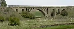 The Rosalia Railroad Bridge was built by the Chicago, Milwaukee, St. Paul and Pacific Railroad (also known as the Milwaukee Road) in 1915 to replace an earlier timber trestle. The bridge was designed as a concrete arch, unusual for a railroad bridge, because it crosses the Northern Pacific Railroad tracks (a rival railroad), a state highway, and is visible from Steptoe Battlefield State Park. The railroad wanted an impressive-looking bridge.[1] The viaduct consists of two spans, separated by an embankment. East of the 334-foot (102 m) embankment there is a 114-foot (35 m) span crossing over the Northern Pacific tracks. To the west is a 502-foot (153 m) span that crosses Pine Creek, railroad tracks, and the highway.