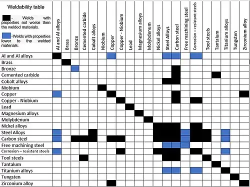 Example of Rotary friction welding weldability table.[10] This is the basic table because the currently known list of materials is much larger and the name alloy systems are classified by a number system (ANSI) or by names indicating their main alloying constituents (DIN and ISO).