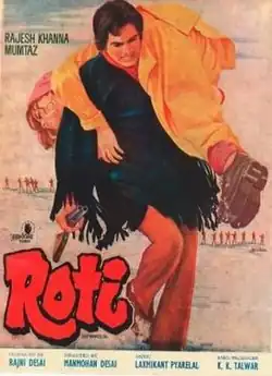 Roti (transl. Flatbread) is a 1974 Indian Hindi-language action film, produced by Rajni Desai and Rajesh Khanna under the banner Aashirwad Pictures Pvt. Ltd and directed by Manmohan Desai. It stars Rajesh Khanna and Mumtaz, with music composed by Laxmikant Pyarelal. This film was released on 11 October 1974, along with Benaam and Roti Kapda Aur Makaan.[1] Kader Khan was reportedly paid ₹1.21 lakhs for writing dialogues for the film.[2] The film was remade in Telugu as Neram Nadi Kadu Akalidi, starring N.T. Rama Rao and Manjula.