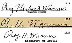 Roy Herbert Warner ((1895-03-13)13 March 1895 – (1942-07-11)11 July 1942) was an American farmer, navy sailor, army soldier, army pilot, airmail pilot, Royal Air Force pilot, and one of ten recipients of the Airmail Flyers' Medal of Honor.