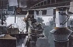 In May 1985, Gainax transferred their operations to a larger studio in Takadanobaba, where the existing staff gathered in friends and acquaintances to help visualize the setting of Royal Space Force.[93] Among those joining the crew at this time were two of the film's most prolific world designers: Takashi Watabe, whose designs would include the train station, rocket factory, and Royal Space Force lecture hall[94] and Yoichi Takizawa, whose contributions included the rocket launch gantry, space capsule simulator, and rocket engine test facility.[95] Yamaga decided the alternate world depicted in the pilot film did not have the kind of different realism he was hoping to achieve in the completed work and started over again, creating a new series of "image board" paintings to visualize the look of Royal Space Force. The total worldbuilding process went on for roughly a year, and was described as a converse process between Yamaga and the team of designers; expressing his ideas into concrete terms, but also bringing their concrete skills to bear toward the expression of abstract ideas.[96] This reciprocal process influenced Yamaga's writing on the film: "My style is not 'I have a story I created, so you help me make it.' Creators come first, and this is a story I created thinking what story those creators would shine at the most."[97]
