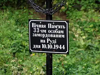 Ruda Różaniecka massacre (Polish: Zbrodnia w Rudzie Różanieckiej; Ukrainian: Вбивства в Руді-Ружанецькій) — execution of Ukrainians in Ruda Różaniecka (now - in the Subcarpathian Voivodeship of Poland), committed on October 10, 1944, by soldiers (military police) of the Milicja Obywatelska and local Poles, in retribution for the killing of Polish foresters & game keepers, resulting in the death of 33 Ukrainians (according to other sources - 32). Relatives of those killed only after the eviction learned about the fate of their loved ones, but do not know the place of their burials.[1]