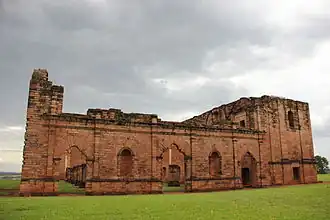 The Reducción de Jesús was initially founded in what is now Alto Parana in 1685 near the Monday river. The mission was relocated several times before arriving in its current location in 1760.[1] Construction of the mission was not completed by the time the Jesuit order was expelled from Paraguay in 1767. The massive mission church was being built as a replica of the Church of Saint Ignatius of Loyola in Italy. It would have been one of the biggest churches of that time, with a central structure of 70 by 24 metres (230 by 79 ft).