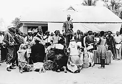La photo montre l'Empereur Luba Albert Ier lors de son intronisation en tant que Mulopwe du peuple Luba. Debout, en costume et couronné, il est entouré de dignitaires Luba et de fonctionnaires. La noblesse Luba, agenouillée devant lui.