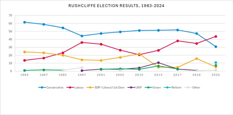 Between 1950 and 2019, it was considered to have been a safe seat for the Conservative Party, whose members have held it without marginal majorities, except for a four-year period from 1966 when it was held by Labour, coinciding with the first Wilson ministry. Unlike other constituencies nearby, such as Broxtowe and Gedling, which were previously held by the Conservatives, they retained Rushcliffe in the 1997 New Labour landslide; however, it would eventually be won by Labour in another Labour landslide in 2024.