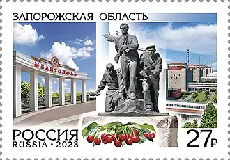 Administrative division of Zaporizhzhya Oblast as a subject of the Russian Federation in a Russian postage stamp from 2023.