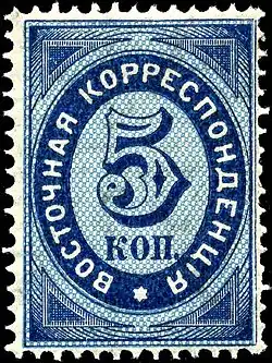 The first postage stamp of the offices was a large square design issued in 1863 and valued at six kopecks. This type is today rare, as were the normal-sized 2k and 20k stamps issued in 1865, which included a sailing ship along with the imperial coat of arms, and "ROPiT" in the inscription. A similar but better-executed design appeared in 1866.