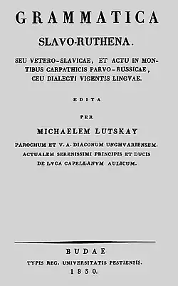 The first linguist was Arsenii Kotsak, who wrote five textbooks on the grammar of Church Slavonic.[1][2][5][6][7] Arsenii considered his work, Slavenorussian grammar, to be the first Rusyn grammar; however, it was not written in the Rusyn language but in Church Slavonic with Rusyn elements.[1][2] In the 1830s, Mikhail Luchkay authored Grammatica Slavo-Ruthena and a Rusyn-Latin-Hungarian-German Dictionary.[1][2] Luchkay also regarded Grammatica Slavo-Ruthena as a Rusyn grammar, though it more accurately describes the grammar of the artificial language Iazychie.[1][2]