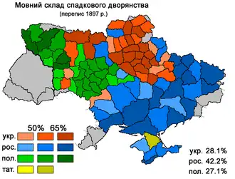 Despite Polonisation in Lithuania and Ruthenia in the 17th-18th centuries, a large part of the lower szlachta managed to retain their cultural identity in various ways.[11][12][13][14] According to Polish estimates from the 1930s, 300,000 members of the common nobles -szlachta zagrodowa - inhabited the subcarpathian region of the Second Polish Republic out of 800,000 in the whole country. 90% of them were Ukrainian-speaking and 80% were Ukrainian Greek Catholics.[15] In other parts of Ukraine with a significant szlachta population, such as the Bar or the Ovruch regions, the situation was similar despite Russification and earlier Polonization.[16][17]