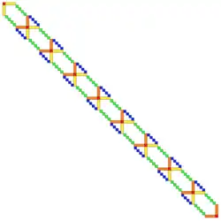 The method has been extended to the Generalized Rybicki-Press algorithm for inverting matrices with entries of the form .[2] The key observation in the Generalized Rybicki-Press (GRP) algorithm is that the matrix is a semi-separable matrix with rank (that is, a matrix whose upper half, not including the main diagonal, is that of some matrix with matrix rank and whose lower half is also that of some possibly different rank matrix[2]) and so can be embedded into a larger band matrix (see figure on the right), whose sparsity structure can be leveraged to reduce the computational complexity. As the matrix has a semi-separable rank of , the computational complexity of solving the linear system or of calculating the determinant of the matrix scales as , thereby making it attractive for large matrices.[2]