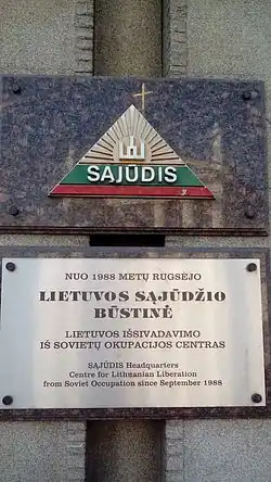 The Sąjūdis (Lithuanian: [ˈsâːjuːdʲɪs], lit.'Movement'), initially known as the Reform Movement of Lithuania (Lithuanian: Lietuvos Persitvarkymo Sąjūdis), is a political organisation which led the struggle for Lithuanian independence in the late 1980s and early 1990s. It was established on 3 June 1988 as the first opposition party in Soviet Lithuania, and was led by Vytautas Landsbergis. Its goal was to seek the return of independent status for Lithuania.