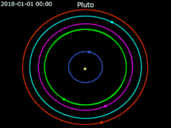 Styx orbits the Pluto–Charon barycenter at a distance of 42,656 km,[4] putting it between the orbits of Charon and Nix. All of Pluto's moons appear to travel in orbits that are very nearly circular and coplanar, described by Styx's discoverer Mark Showalter as "neatly nested ... a bit like Russian dolls".[17]