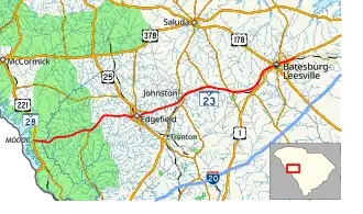 SC 23 is a two-lane rural highway that travels from Modoc, within the Sumter National Forest and near Lake Strom Thurmond, to Batesburg-Leesville. The highway travels through mostly either forest or farmland, while connecting with the city and towns of Edgefield, Johnston, Ward, Ridge Spring and Monetta. Between Monetta and Batesburg-Leesville, SC 23 parallels to the north of US 1.[5]