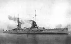 After her commissioning in January 1913, Friedrich der Grosse conducted sea trials before becoming the fleet flagship on 2 March,[8] replacing Deutschland.[10] The ship participated in her first round of fleet maneuvers in February 1913, which were conducted in the Kattegat and the North Sea. The next month saw another round of exercises, from 12 to 14 March. The ship went into dock for periodic maintenance in April, and was ready for artillery training by the end of the month. Extensive fleet maneuvers were conducted in the North Sea from 5 to 27 May. Friedrich der Grosse, as the Navy's newest battleship, was sent to Kiel for Kiel Week in June.[8] While there, she was visited by the Italian king Victor Emmanuel III and his wife Elena.[9] In mid-July, the fleet conducted its annual summer cruise to Norway, which lasted until mid-August. During the cruise, Friedrich der Grosse visited Balholmen, Norway. The autumn maneuvers followed after the fleet returned; they lasted from 31 August to 9 September. Unit drills and individual ship training were conducted in October and November.[8]