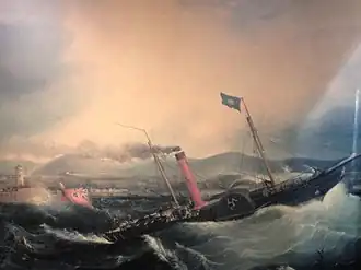 The seamanship of Capt. Gill again came to the fore on 20 November. Having discharged passengers and cargo at Douglas, he decided to put to sea foreseeing a dangerous south-easterly gale. Lieutenant Tudor, in charge of St. George, anchored in Douglas Bay but lost the vessel in the night when her cable parted and she went aground on the Conister Rock and broke up.[16] Through the efforts of Sir William Hillary, founder of the Royal National Lifeboat Institution, the crew of the St. George were saved.[17]